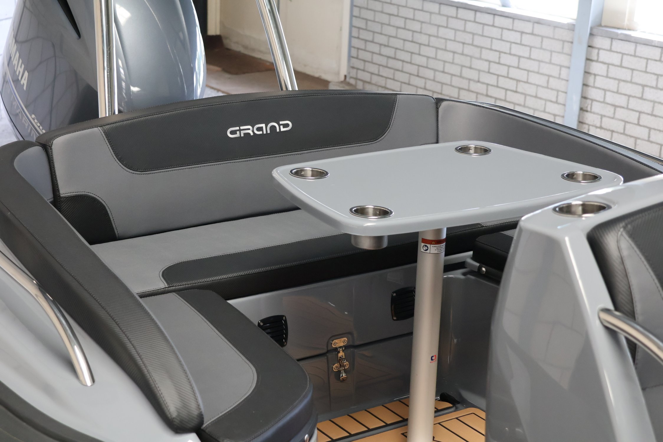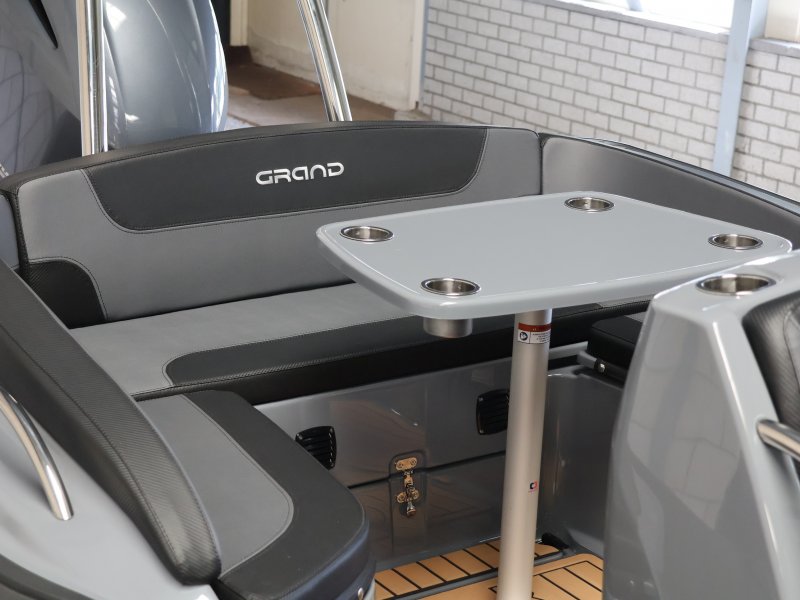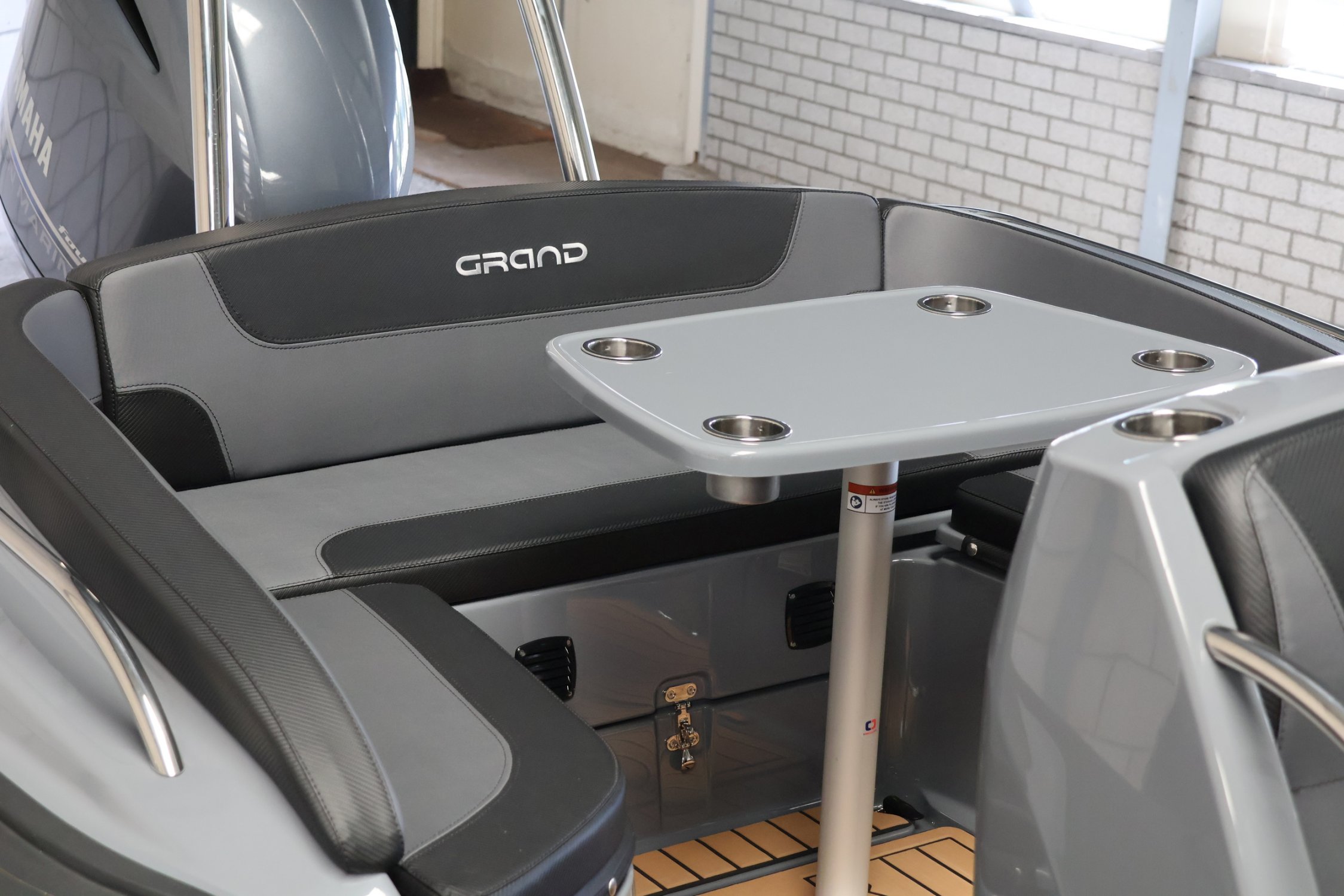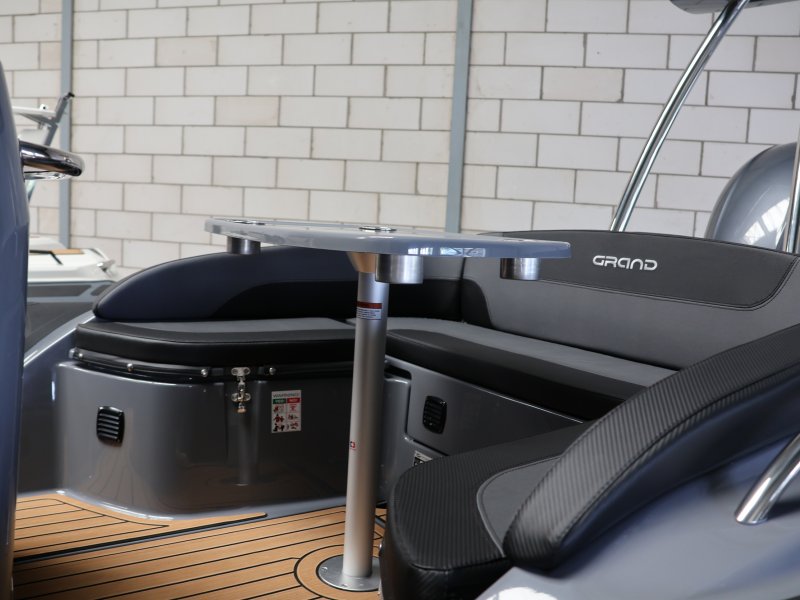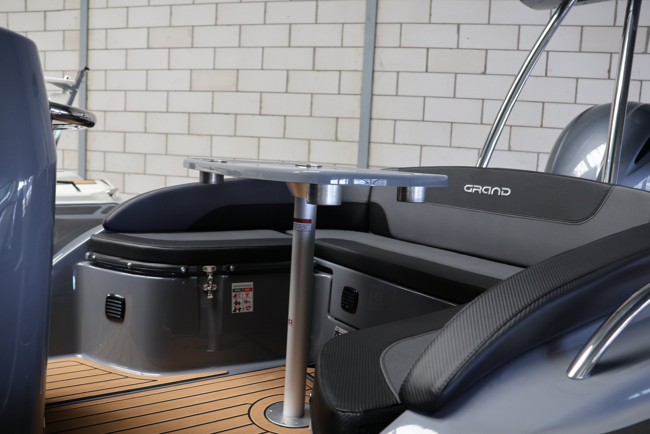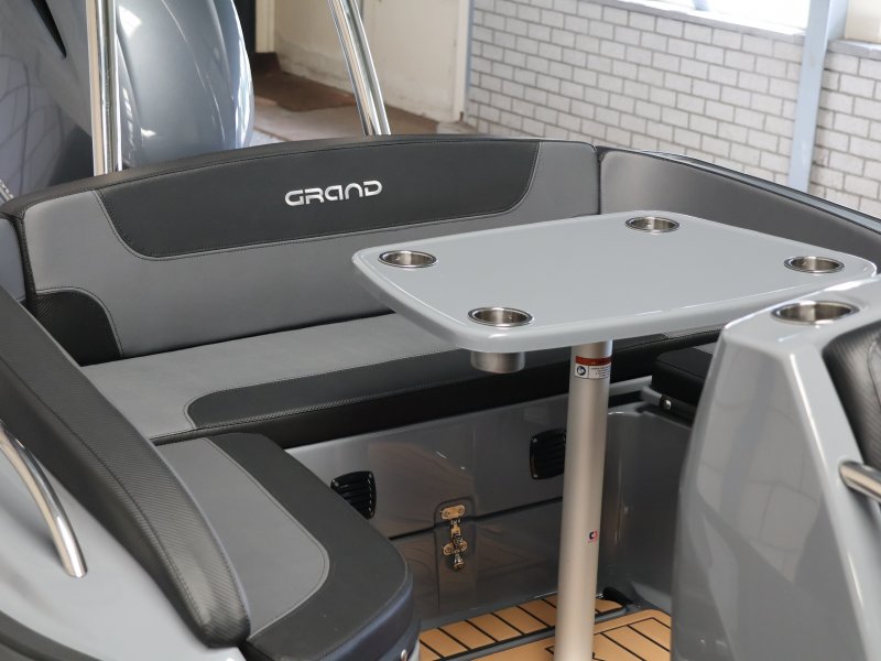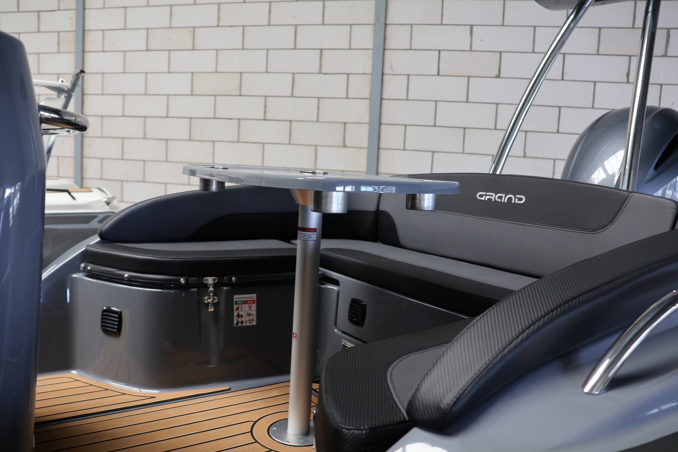 Die Grand Golden Line 650 ist eine perfekte Mischung aus stilvollem Design, hochwertiger Verarbeitung und funktionellem Luxus. Die Black Fabric Impression-Rohre sorgen für einen sportlichen, robusten Look und zusätzliche Haltbarkeit. Das dunkelgraue Gelcoat verleiht dem Boot ein zeitloses und elegantes Aussehen, während die beiden Badeplattformen mit Badeleiter einen einfachen Einstieg ins Wasser ermöglichen.