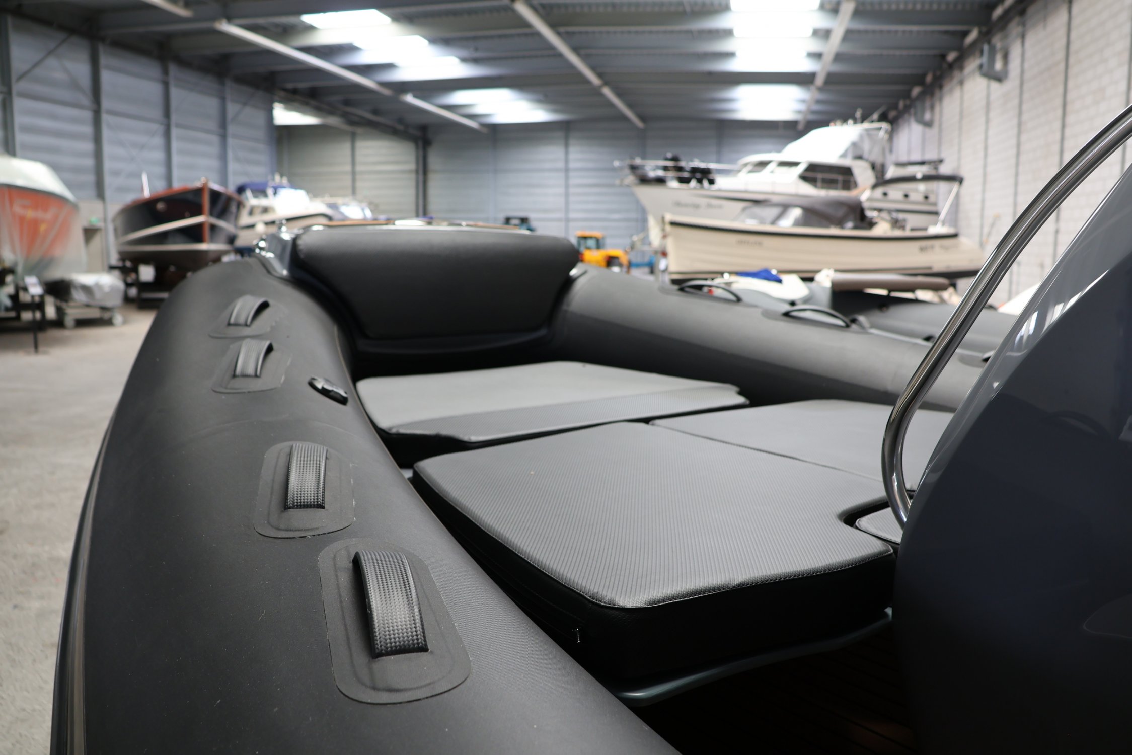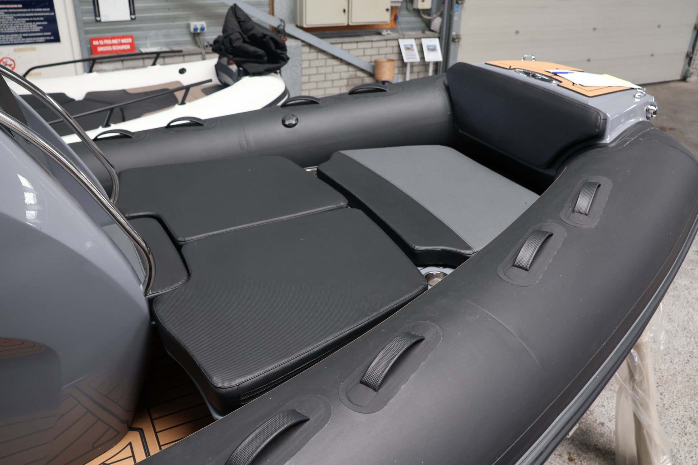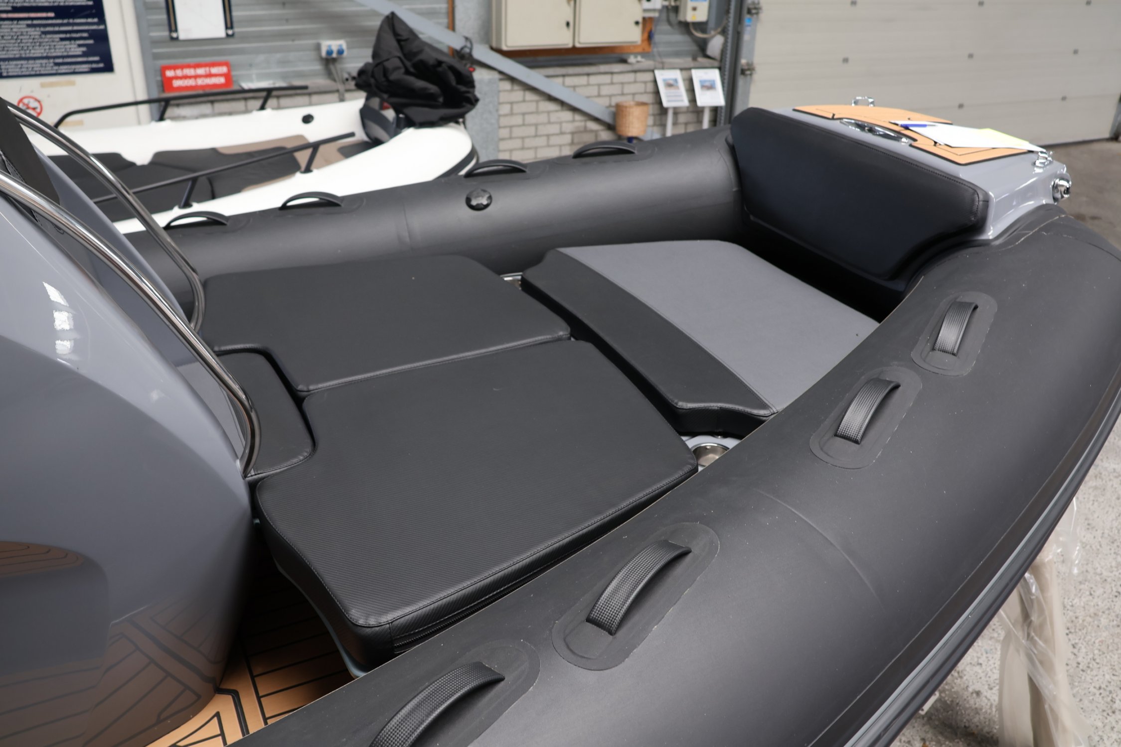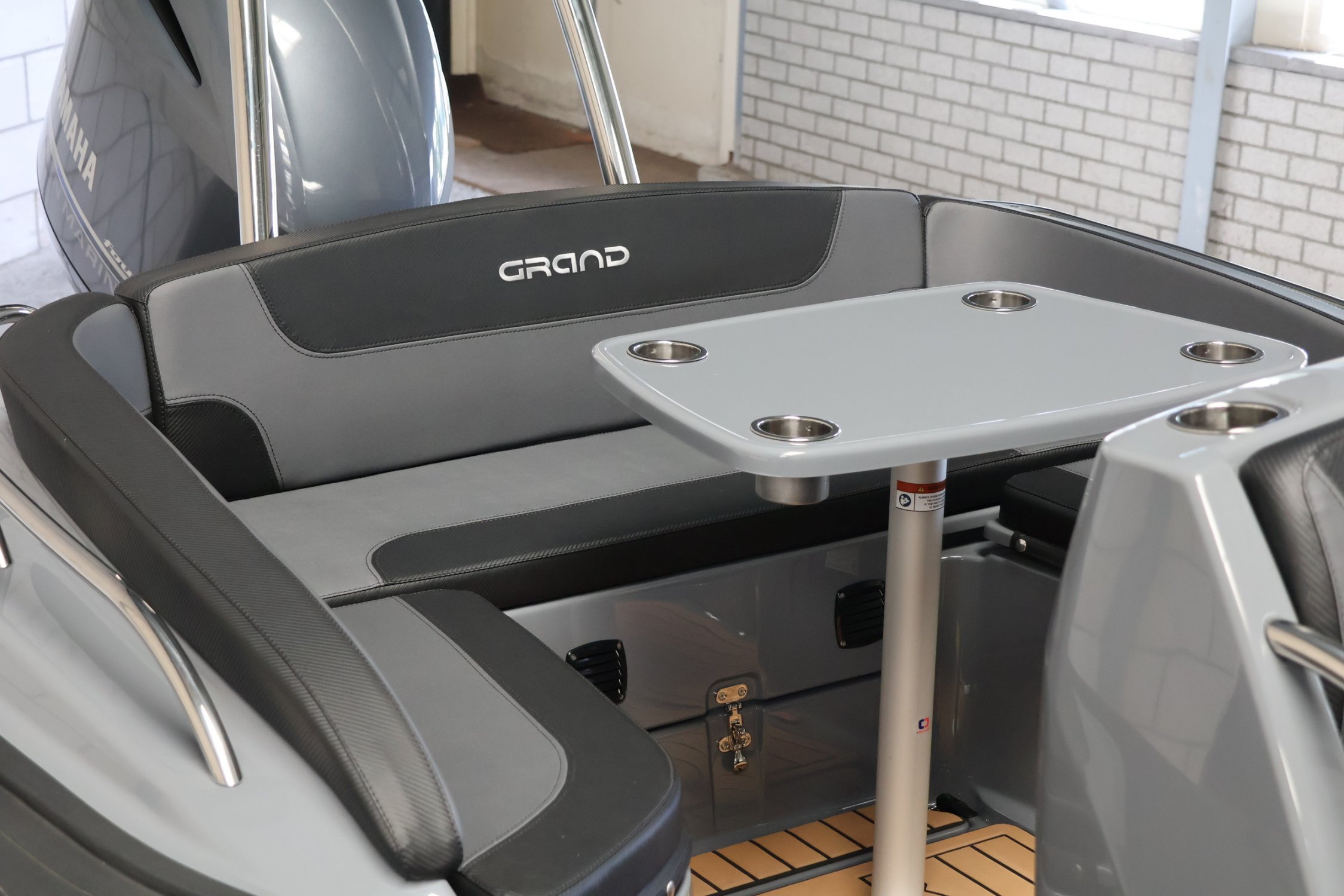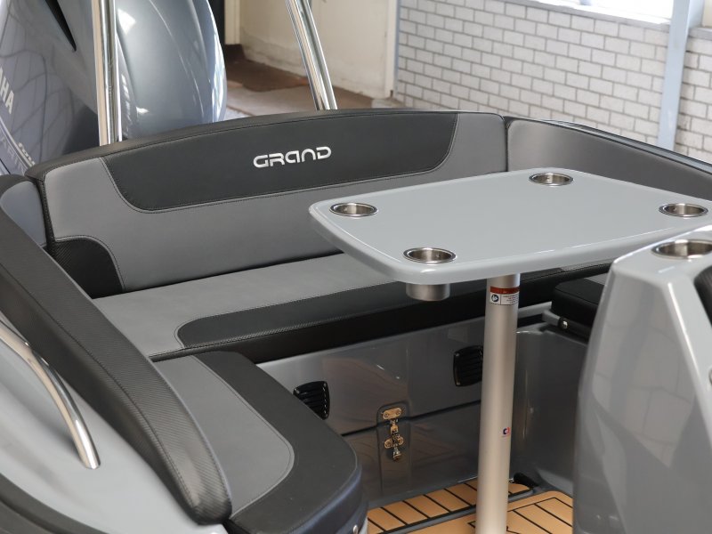 Die Grand Golden Line 650 ist eine perfekte Mischung aus stilvollem Design, hochwertiger Verarbeitung und funktionellem Luxus. Die Black Fabric Impression-Rohre sorgen für einen sportlichen, robusten Look und zusätzliche Haltbarkeit. Das dunkelgraue Gelcoat verleiht dem Boot ein zeitloses und elegantes Aussehen, während die beiden Badeplattformen mit Badeleiter einen einfachen Einstieg ins Wasser ermöglichen.