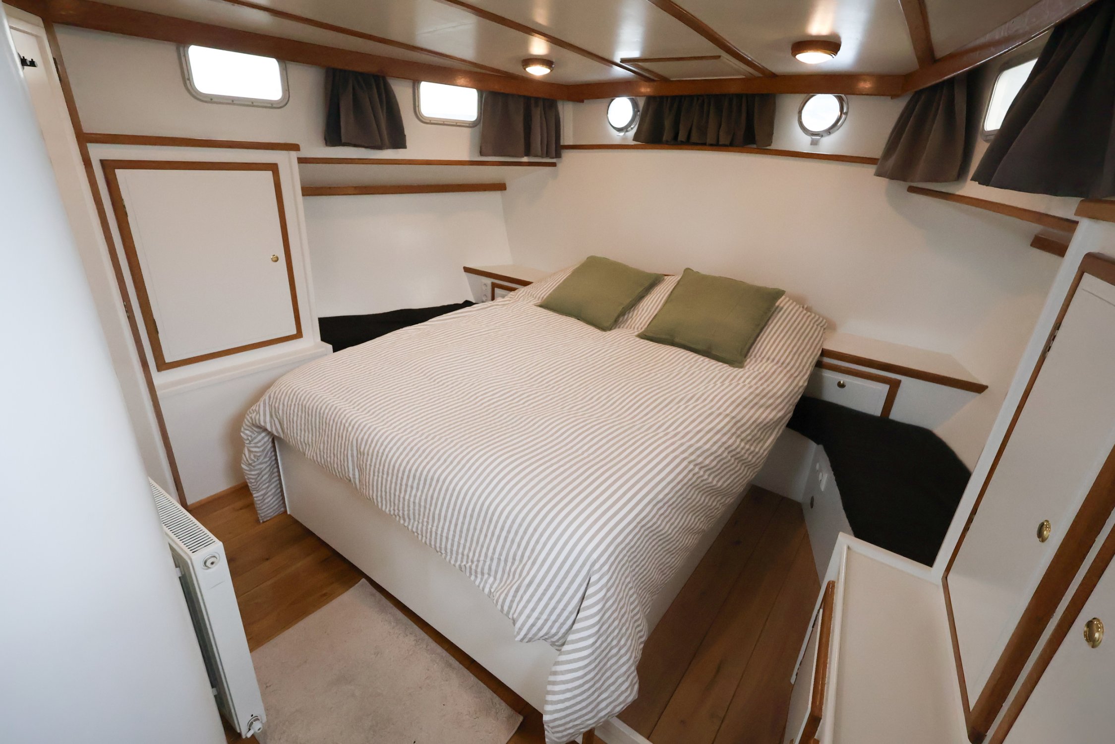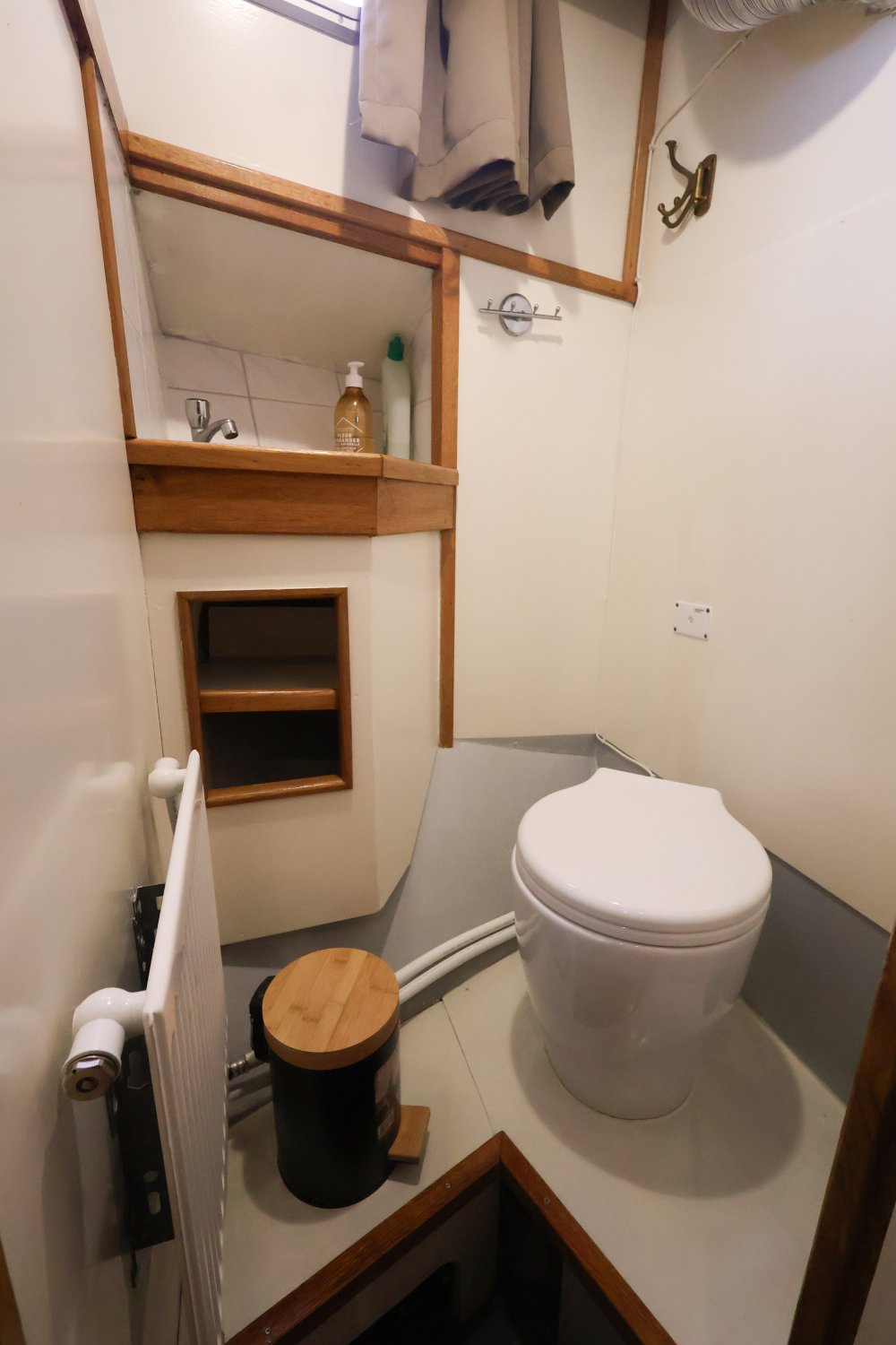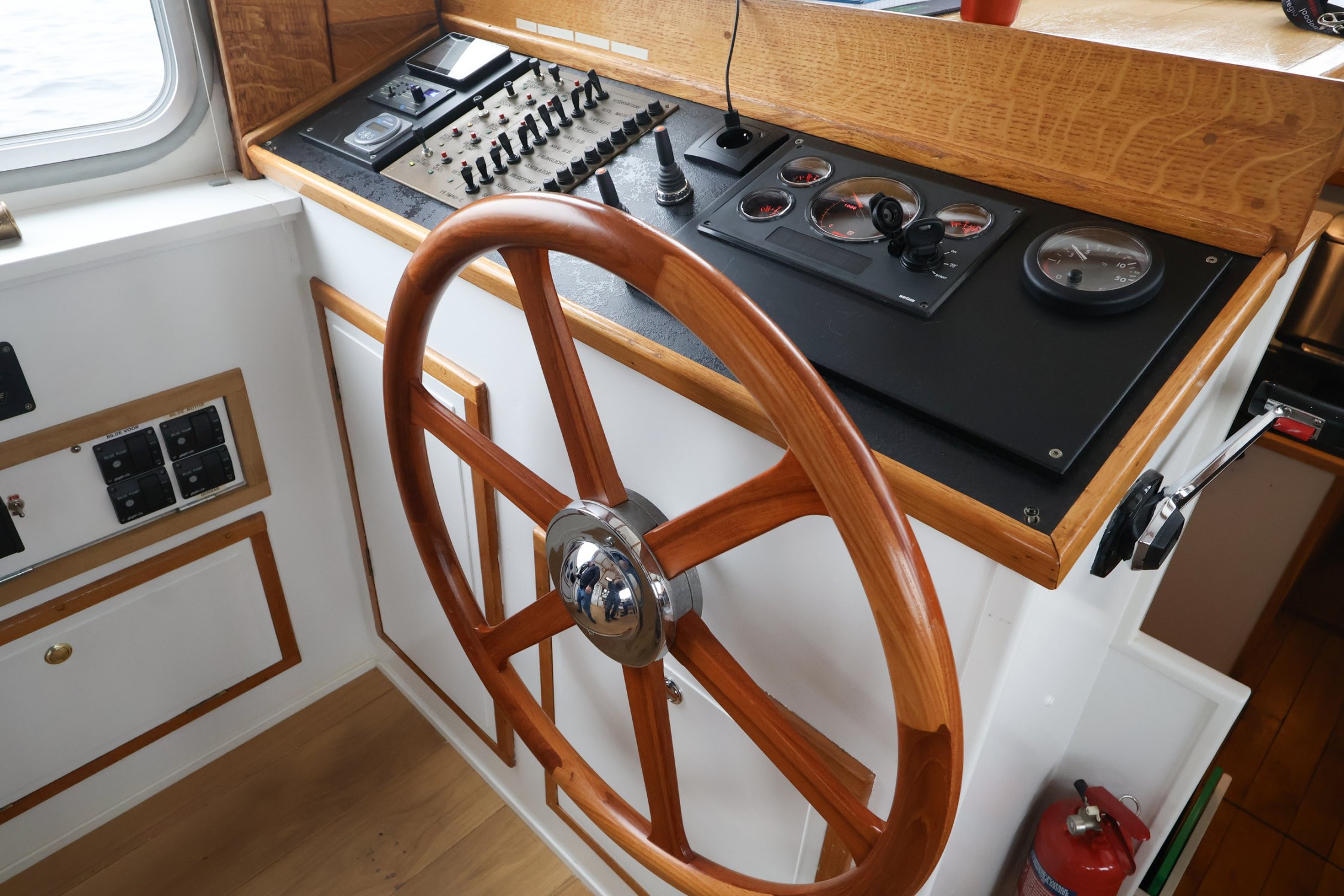 There are two electric toilets, including a new Tecma toilet in the aft cabin (2024). The interior was recently painted, fitted with new curtains with pleats, and the wheelhouse has a new oak floor (2025).