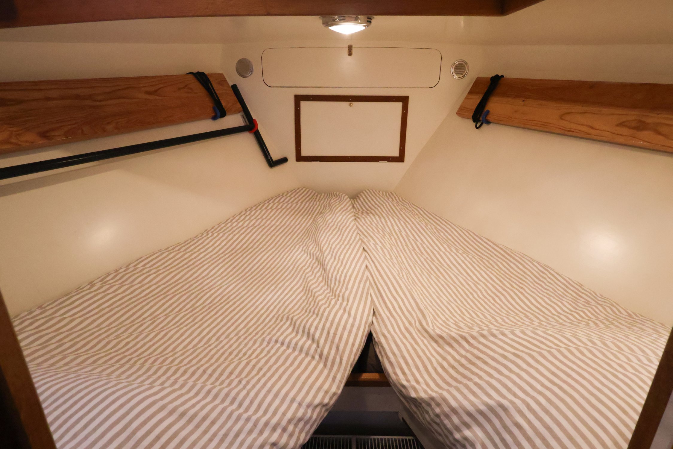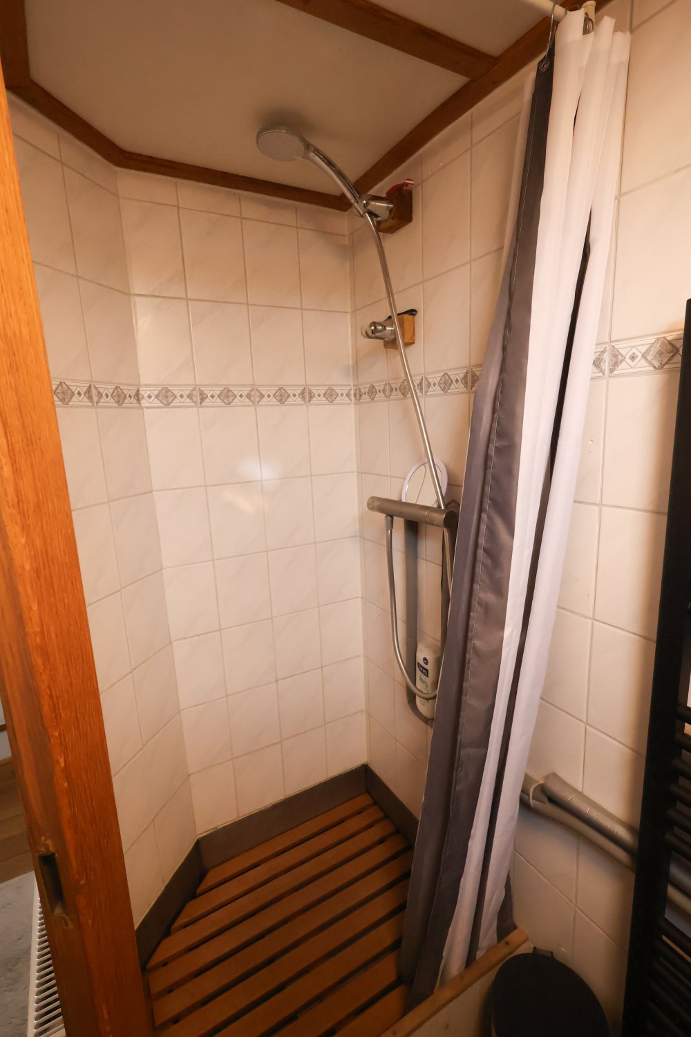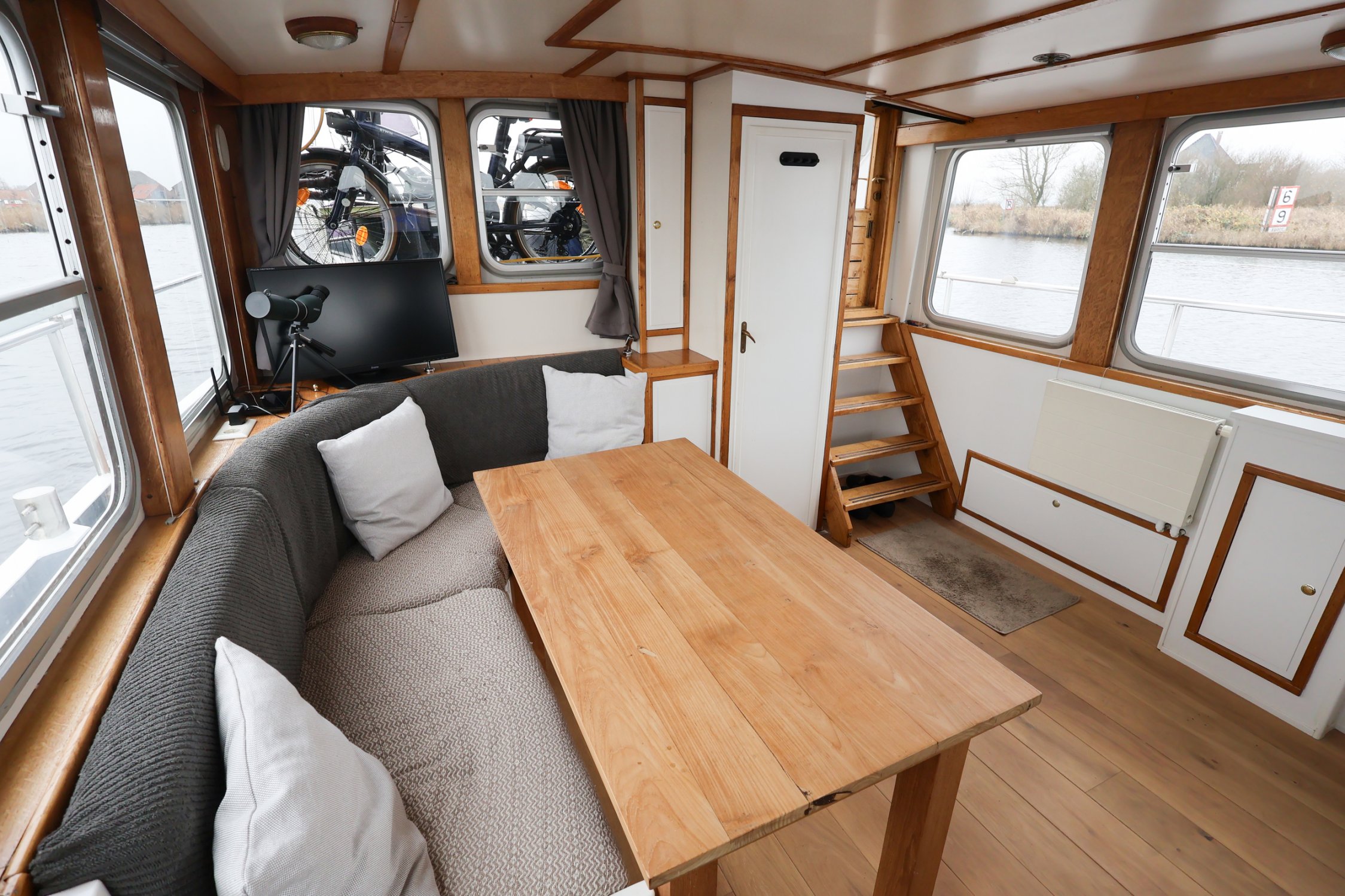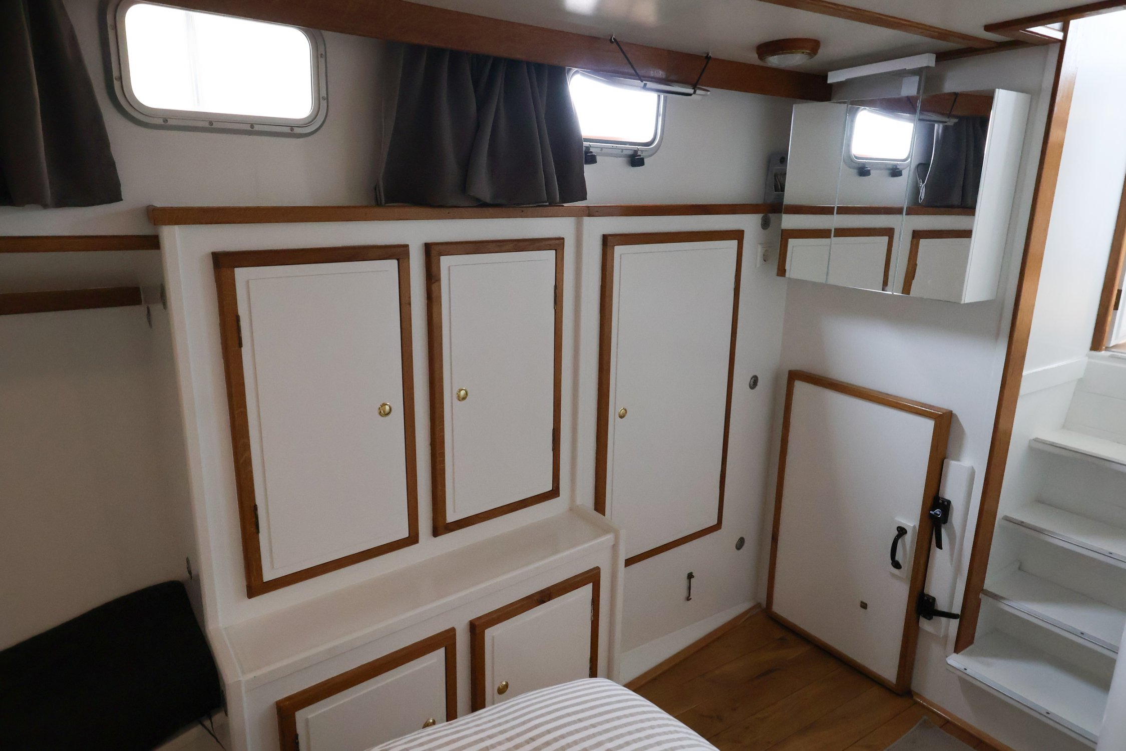 There are two electric toilets, including a new Tecma toilet in the aft cabin (2024). The interior was recently painted, fitted with new curtains with pleats, and the wheelhouse has a new oak floor (2025).