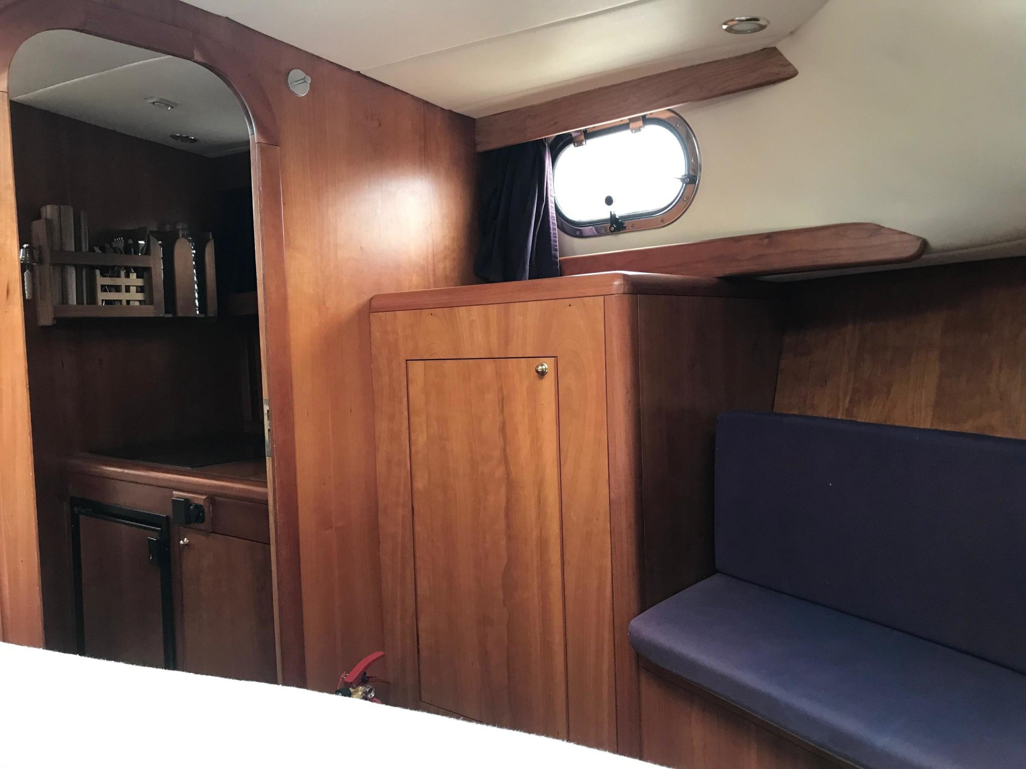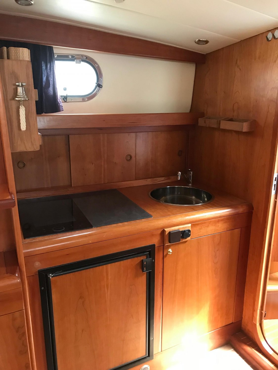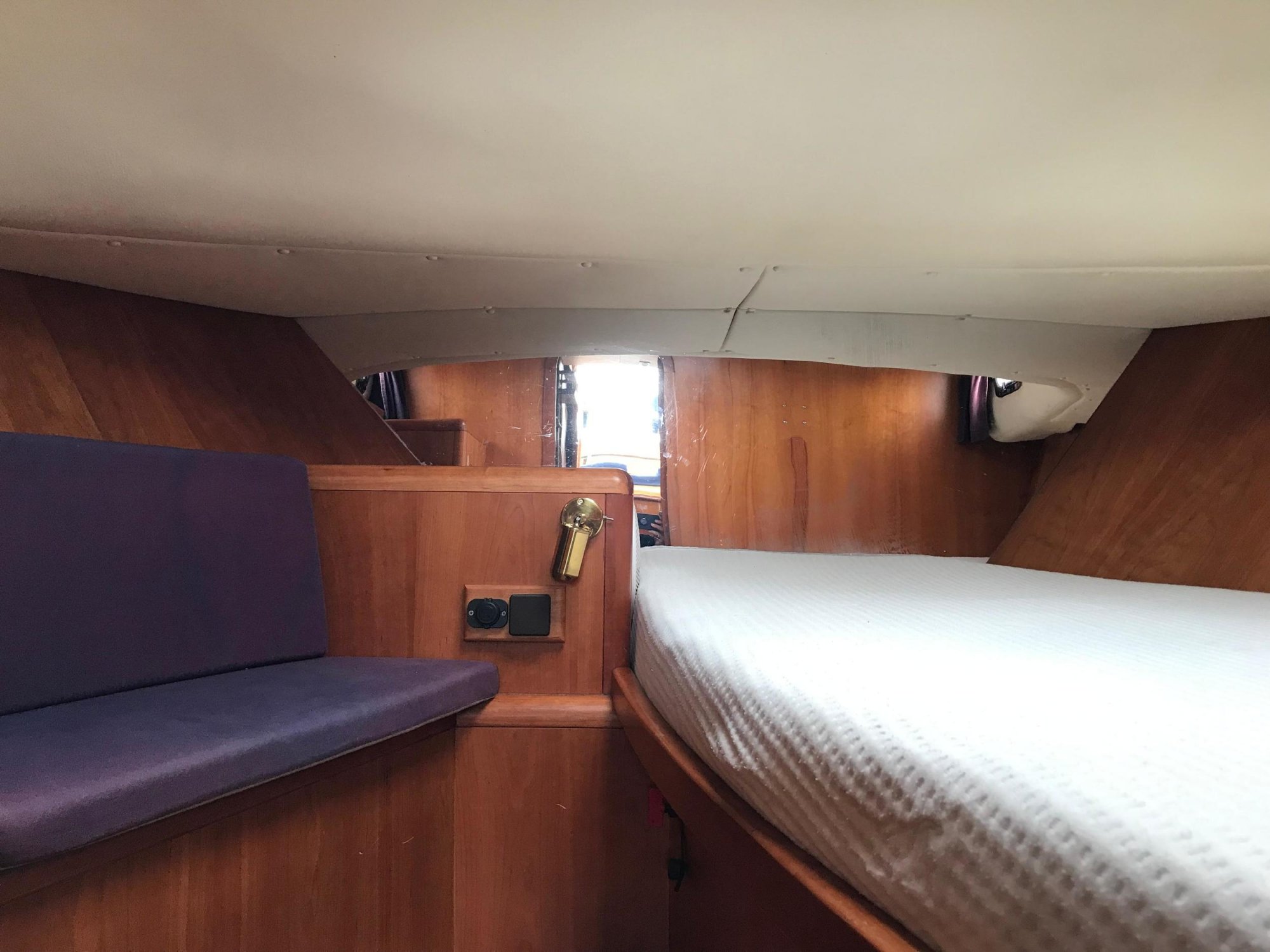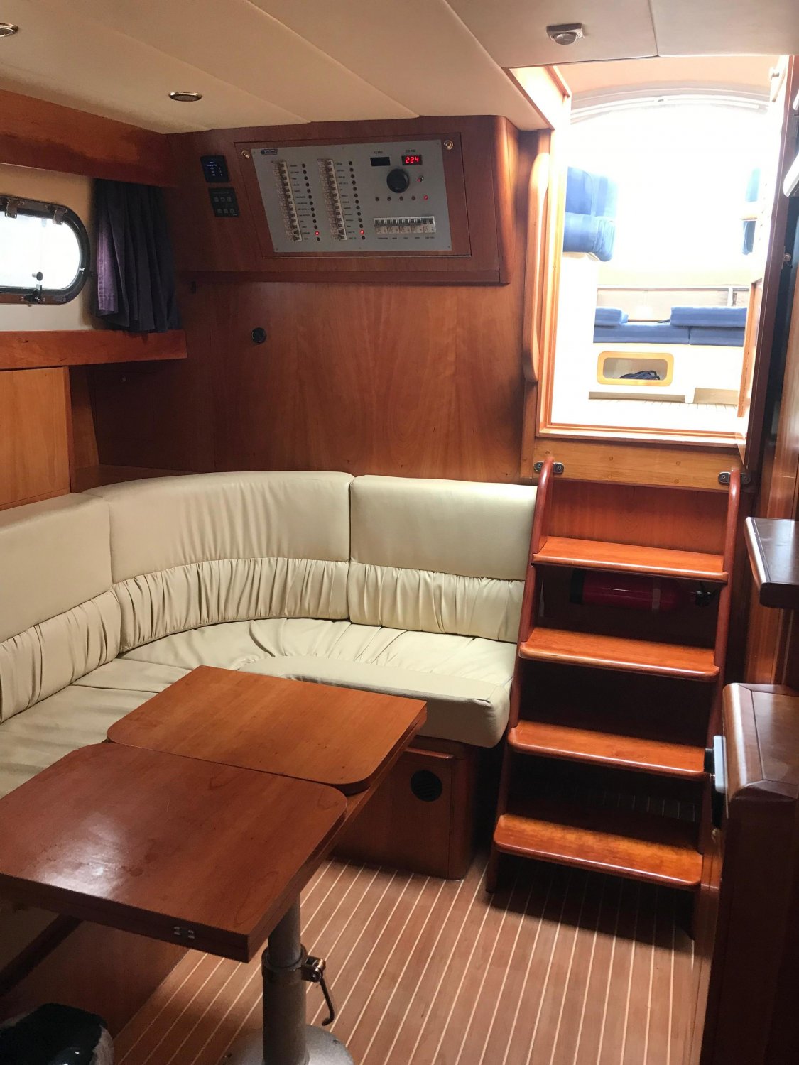 Inside, the Mare Libre offers a surprising amount of space and luxury. With a headroom of approx. 188 cm, a cozy salon with U-bench (convertible into extra bed) and a spacious front cabin with double bed, spending the night on board is no problem at all. The neat bathroom has an electric toilet, shower and sink, which completes the comfort.